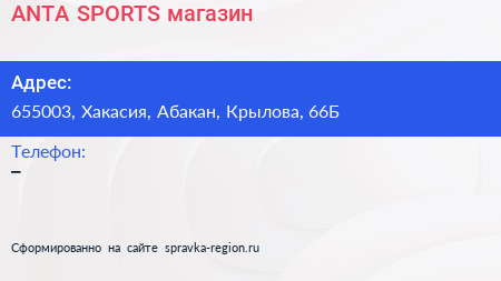 ANTA SPORTS, магазин по адресу 655003, Хакасия, Абакан, Крылова, 66Б в дальнейшем Организация, размещена в следующих категориях: