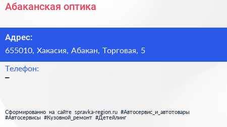 Абаканская оптика по адресу 655010, Хакасия, Абакан, Торговая, 5 в дальнейшем Организация, размещена в следующих категориях: