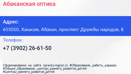 Абаканская оптика по адресу 655010, Хакасия, Абакан, проспект Дружбы народов, 8 в дальнейшем Организация, размещена в следующих категориях: