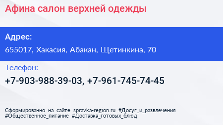 Афина, салон верхней одежды по адресу 655017, Хакасия, Абакан, Щетинкина, 70 в дальнейшем Организация, размещена в следующих категориях: