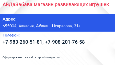 АйДаЗабава, магазин развивающих игрушек по адресу 655004, Хакасия, Абакан, Некрасова, 31а в дальнейшем Организация, размещена в следующих категориях: