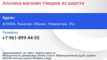 Альпака, магазин товаров из шерсти по адресу 655004, Хакасия, Абакан, Некрасова, 31а в дальнейшем Организация, размещена в следующих категориях: