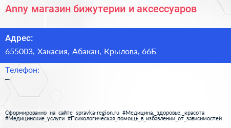 Anny, магазин бижутерии и аксессуаров по адресу 655003, Хакасия, Абакан, Крылова, 66Б в дальнейшем Организация, размещена в следующих категориях: