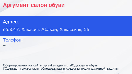 Аргумент, салон обуви по адресу 655017, Хакасия, Абакан, Хакасская, 56 в дальнейшем Организация, размещена в следующих категориях: