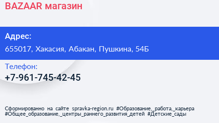 BAZAAR, магазин по адресу 655017, Хакасия, Абакан, Пушкина, 54Б в дальнейшем Организация, размещена в следующих категориях: