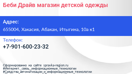 Беби-Драйв, магазин детской одежды по адресу 655004, Хакасия, Абакан, Итыгина, 10а к1 в дальнейшем Организация, размещена в следующих категориях: