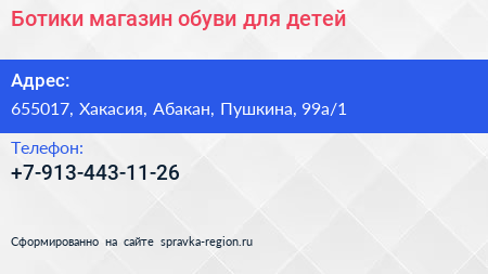 Ботики, магазин обуви для детей по адресу 655017, Хакасия, Абакан, Пушкина, 99а/1 в дальнейшем Организация, размещена в следующих категориях: