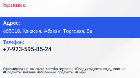 Брошка по адресу 655010, Хакасия, Абакан, Торговая, 5а в дальнейшем Организация, размещена в следующих категориях: