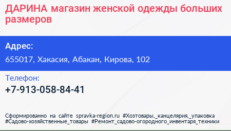 ДАРИНА, магазин женской одежды больших размеров по адресу 655017, Хакасия, Абакан, Кирова, 102 в дальнейшем Организация, размещена в следующих категориях: