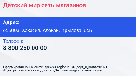 Детский мир, сеть магазинов по адресу 655003, Хакасия, Абакан, Крылова, 66Б в дальнейшем Организация, размещена в следующих категориях: