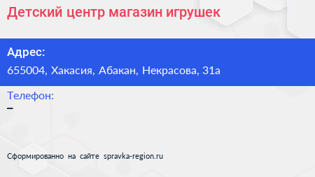 Детский центр, магазин игрушек по адресу 655004, Хакасия, Абакан, Некрасова, 31а в дальнейшем Организация, размещена в следующих категориях: