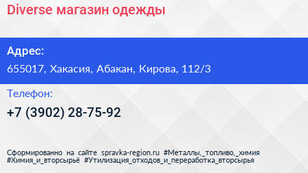 Diverse, магазин одежды по адресу 655017, Хакасия, Абакан, Кирова, 112/3 в дальнейшем Организация, размещена в следующих категориях: