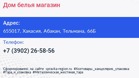 Дом белья, магазин по адресу 655017, Хакасия, Абакан, Тельмана, 66Б в дальнейшем Организация, размещена в следующих категориях: