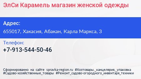 ЭлСи Карамель, магазин женской одежды по адресу 655017, Хакасия, Абакан, Карла Маркса, 3 в дальнейшем Организация, размещена в следующих категориях: