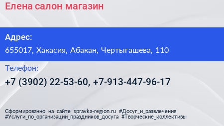 Елена, салон-магазин по адресу 655017, Хакасия, Абакан, Чертыгашева, 110 в дальнейшем Организация, размещена в следующих категориях: