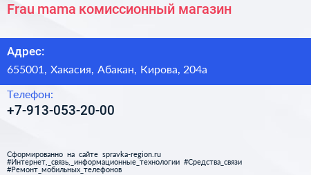 Frau mama, комиссионный магазин по адресу 655001, Хакасия, Абакан, Кирова, 204а в дальнейшем Организация, размещена в следующих категориях: