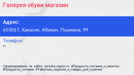 Галерея обуви, магазин по адресу 655017, Хакасия, Абакан, Пушкина, 99 в дальнейшем Организация, размещена в следующих категориях: