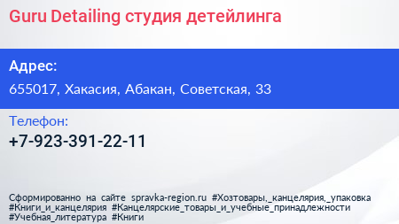 Guru Detailing, студия детейлинга по адресу 655017, Хакасия, Абакан, Советская, 33 в дальнейшем Организация, размещена в следующих категориях: