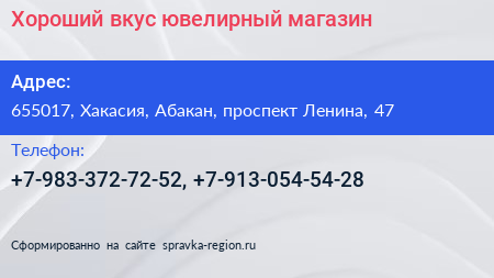 Хороший вкус, ювелирный магазин по адресу 655017, Хакасия, Абакан, проспект Ленина, 47 в дальнейшем Организация, размещена в следующих категориях: