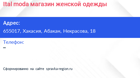 Ital moda, магазин женской одежды по адресу 655017, Хакасия, Абакан, Некрасова, 18 в дальнейшем Организация, размещена в следующих категориях: