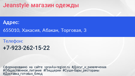 Jeanstyle, магазин одежды по адресу 655010, Хакасия, Абакан, Торговая, 3 в дальнейшем Организация, размещена в следующих категориях: