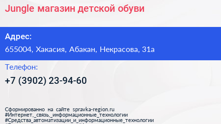 Jungle, магазин детской обуви по адресу 655004, Хакасия, Абакан, Некрасова, 31а в дальнейшем Организация, размещена в следующих категориях: