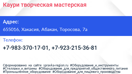 Каури, творческая мастерская по адресу 655016, Хакасия, Абакан, Торосова, 7а в дальнейшем Организация, размещена в следующих категориях: