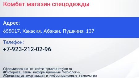Комбат, магазин спецодежды по адресу 655017, Хакасия, Абакан, Пушкина, 137 в дальнейшем Организация, размещена в следующих категориях:
