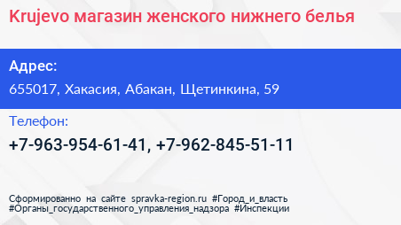 Krujevo, магазин женского нижнего белья по адресу 655017, Хакасия, Абакан, Щетинкина, 59 в дальнейшем Организация, размещена в следующих категориях: