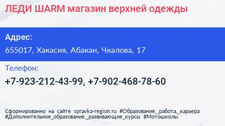 ЛЕДИ ШАRМ, магазин верхней одежды по адресу 655017, Хакасия, Абакан, Чкалова, 17 в дальнейшем Организация, размещена в следующих категориях:
