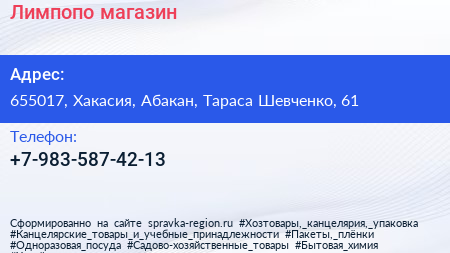 Лимпопо, магазин по адресу 655017, Хакасия, Абакан, Тараса Шевченко, 61 в дальнейшем Организация, размещена в следующих категориях: