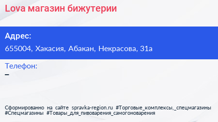 Lova, магазин бижутерии по адресу 655004, Хакасия, Абакан, Некрасова, 31а в дальнейшем Организация, размещена в следующих категориях: