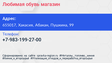 Любимая обувь, магазин по адресу 655017, Хакасия, Абакан, Пушкина, 99 в дальнейшем Организация, размещена в следующих категориях: