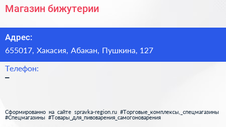 Магазин бижутерии по адресу 655017, Хакасия, Абакан, Пушкина, 127 в дальнейшем Организация, размещена в следующих категориях: