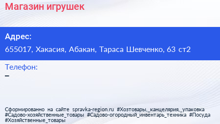 Магазин игрушек по адресу 655017, Хакасия, Абакан, Тараса Шевченко, 63 ст2 в дальнейшем Организация, размещена в следующих категориях: