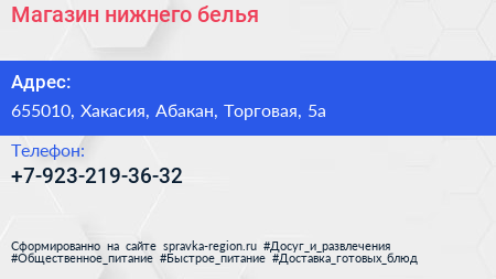 Магазин нижнего белья по адресу 655010, Хакасия, Абакан, Торговая, 5а в дальнейшем Организация, размещена в следующих категориях: