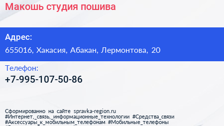 Макошь, студия пошива по адресу 655016, Хакасия, Абакан, Лермонтова, 20 в дальнейшем Организация, размещена в следующих категориях:
