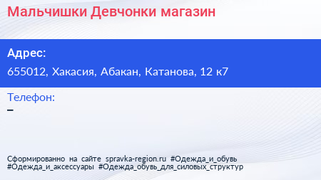 Мальчишки & Девчонки, магазин по адресу 655012, Хакасия, Абакан, Катанова, 12 к7 в дальнейшем Организация, размещена в следующих категориях: