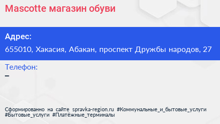 Mascotte, магазин обуви по адресу 655010, Хакасия, Абакан, проспект Дружбы народов, 27 в дальнейшем Организация, размещена в следующих категориях: