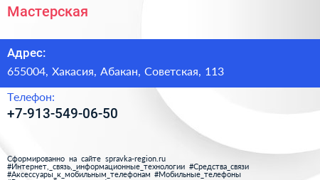 Мастерская по адресу 655004, Хакасия, Абакан, Советская, 113 в дальнейшем Организация, размещена в следующих категориях:
