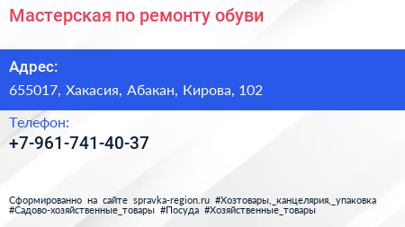 Мастерская по ремонту обуви по адресу 655017, Хакасия, Абакан, Кирова, 102 в дальнейшем Организация, размещена в следующих категориях: