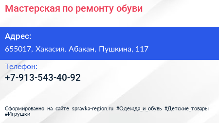 Мастерская по ремонту обуви по адресу 655017, Хакасия, Абакан, Пушкина, 117 в дальнейшем Организация, размещена в следующих категориях:
