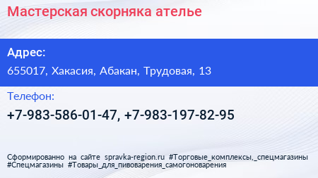 Мастерская скорняка, ателье по адресу 655017, Хакасия, Абакан, Трудовая, 13 в дальнейшем Организация, размещена в следующих категориях:
