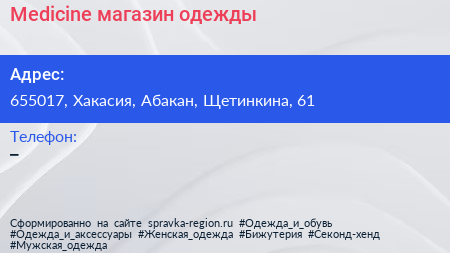 Medicine, магазин одежды по адресу 655017, Хакасия, Абакан, Щетинкина, 61 в дальнейшем Организация, размещена в следующих категориях:
