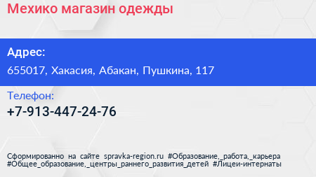 Мехико, магазин одежды по адресу 655017, Хакасия, Абакан, Пушкина, 117 в дальнейшем Организация, размещена в следующих категориях: