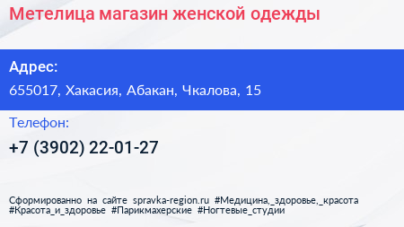Метелица, магазин женской одежды по адресу 655017, Хакасия, Абакан, Чкалова, 15 в дальнейшем Организация, размещена в следующих категориях: