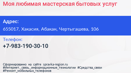 Моя любимая, мастерская бытовых услуг по адресу 655017, Хакасия, Абакан, Чертыгашева, 106 в дальнейшем Организация, размещена в следующих категориях: