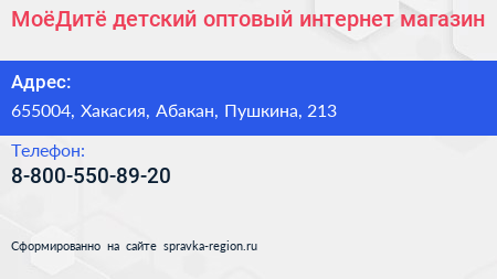 МоёДитё, детский оптовый интернет-магазин по адресу 655004, Хакасия, Абакан, Пушкина, 213 в дальнейшем Организация, размещена в следующих категориях: