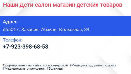 Наши Дети, салон-магазин детских товаров по адресу 655017, Хакасия, Абакан, Колхозная, 34 в дальнейшем Организация, размещена в следующих категориях: