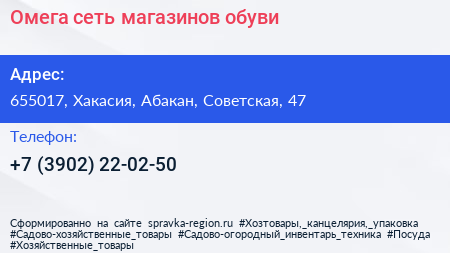 Омега, сеть магазинов обуви по адресу 655017, Хакасия, Абакан, Советская, 47 в дальнейшем Организация, размещена в следующих категориях: